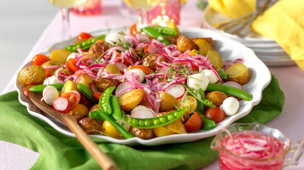 Den här våriga salladen med delikatesspotatis, minimozzarellor och rädisor passar bra både till middagen och på påskbordet.