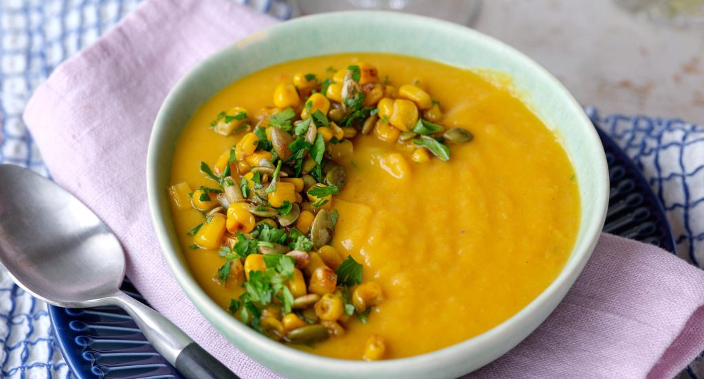 Sötpotatissoppa med majs- och pumpatopping