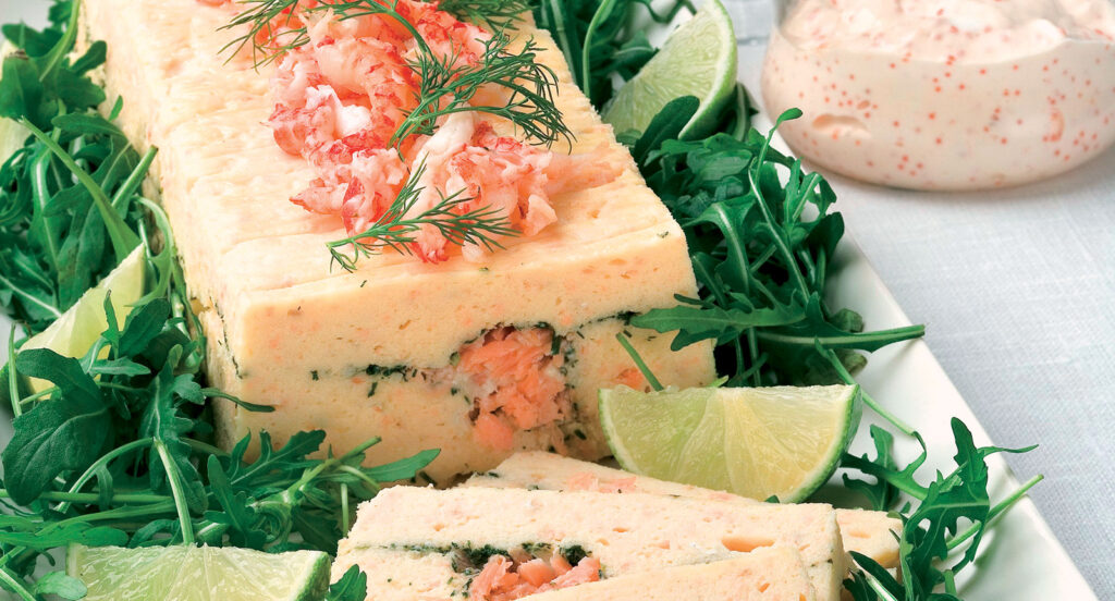 Blanda samman lättmajonnäs och gräddfil. Tillsätt löjrom, salt och peppar. Smaka av såsen. Ställ den kallt till serveringen. Dekorera patén med kräftstjärtar, dill och rucolasallat. Servera patén med limeklyftor, romsås, sallad och kokt potatis.