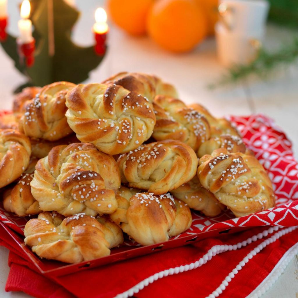 Vik plattan dubbel på längden. Skär 18 bitar av varje platta och skär ett snitt i varje bit nästan hela vägen upp. Remsan ska se ut som en byxa. Snurra bitarna och forma en knut. Lägg bullarna på en plåt med bakplåtspapper och låt jäsa övertäckta, 30 minuter.