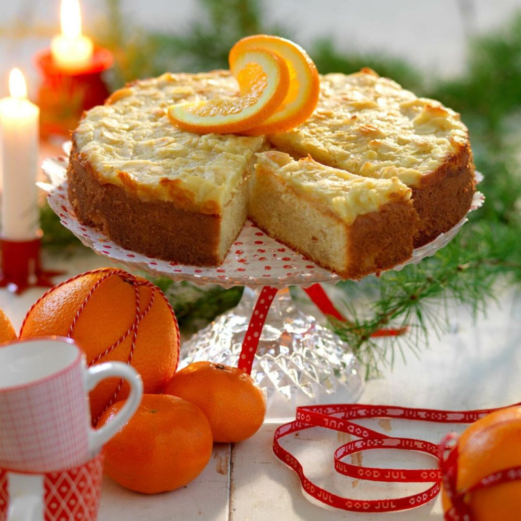 Toscasmet: Smält smöret i en kastrull. Tillsätt apelsinsaft och socker och rör om. Vispa i mjöl och grädde och värm smeten under omrörning tills den tjocknar. Rör i mandelspån. Bred försiktigt smeten över kakan. Höj ugnsvärmen till 200° och grädda tills den fått fin färg, ca 10 minuter
