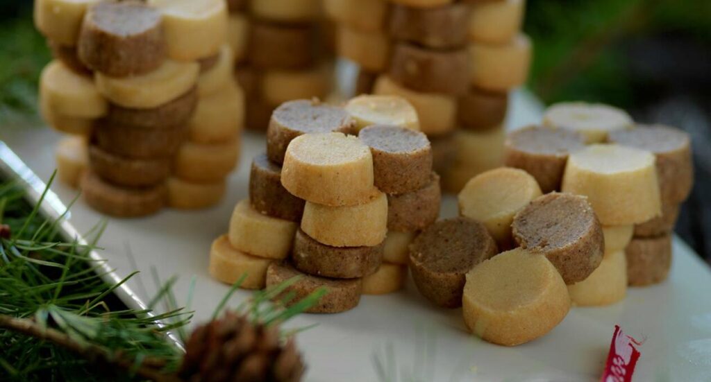 Tryck ihop längderna lätt och låt dem ligga i frysen i 30 minuter. Skär dem i knappt 1 cm tjocka skivor. Lägg skivorna på en plåt med bakplåtspapper och grädda mitt i ugnen, ca 15 minuter.
