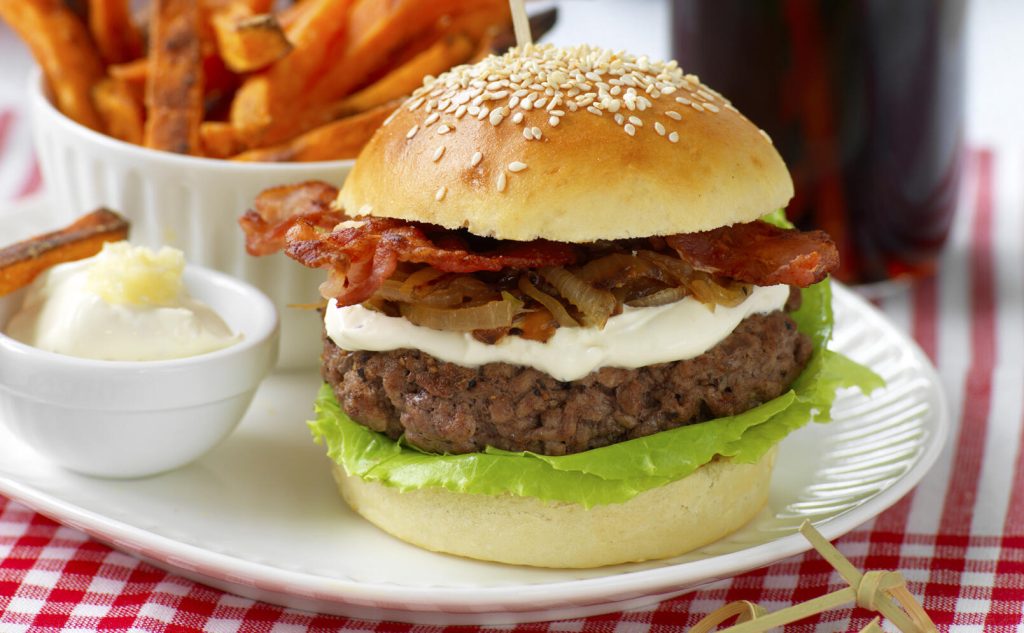 Stek burgarna på ganska hög värme, ca 2 minuter per sida. Tryck till dem så de inte drar ihop sig och blir höga utan behåller sin form. Lägg ihop burgarna med sallad, biff, stekt lök, bacon och dressing.