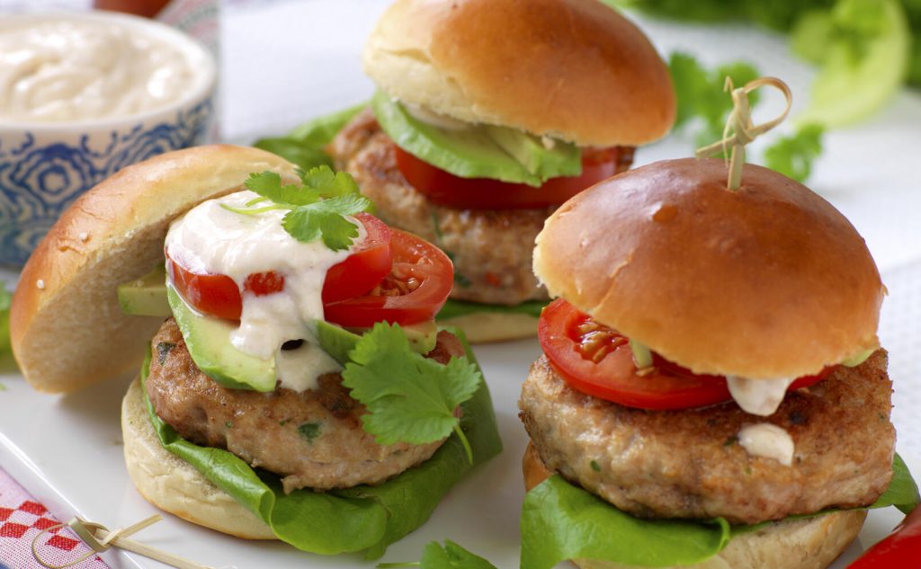 Lägg ihop burgarna med sallad, biff, tomater, dressing, avokado och koriander.