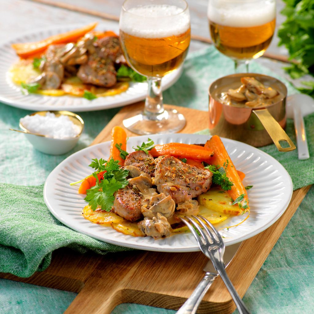 Servera köttet med ugnsstekt potatis, krämig svamp och morötter. Garnera med persilja.