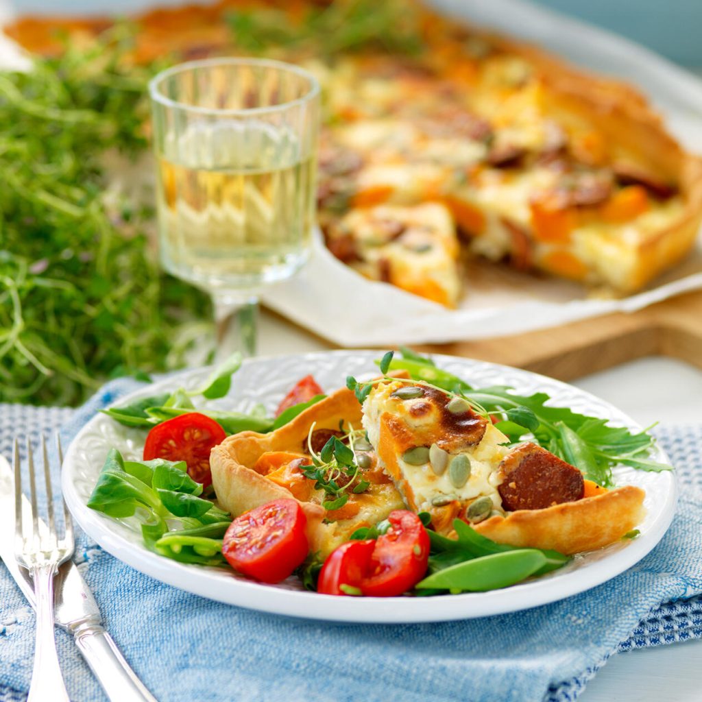 Lägg sötpotatis och lök i det förgräddade pajskalet. Skiva korven och stek den i sitt eget fett i stekpanna. Lägg i pajskalet. Smula över fetaost.