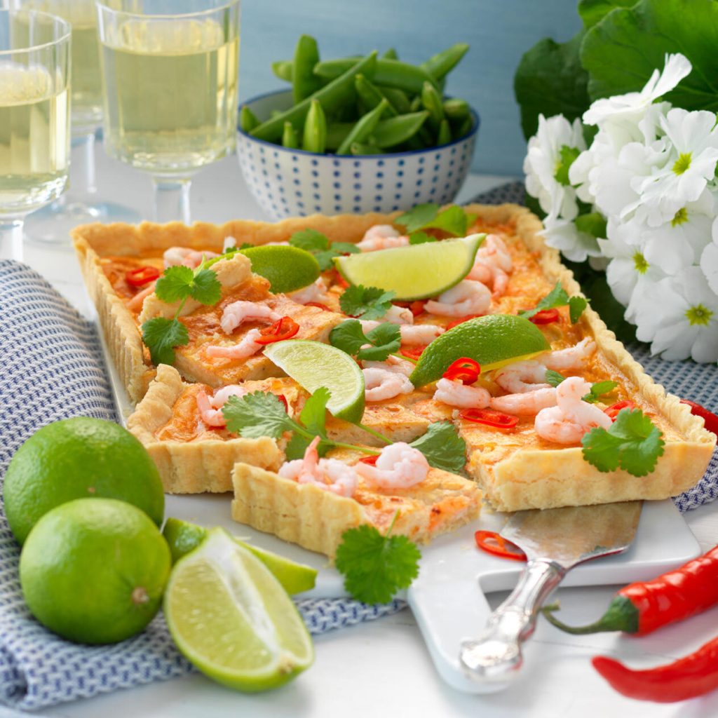 Fyllning: Vispa samman ägg, kesella, ost, hackad chili, chipotlepasta, rökt paprikapulver och salt. Vänd ner hälften av räkorna och häll i det förgräddade pajskalet.