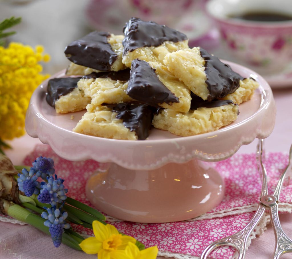 Låt kakan svalna och skär i rutor innan den stelnat helt. Smält chokladen över vattenbad. Pensla chokladdiagonalt på kakorna och låt stelna.
