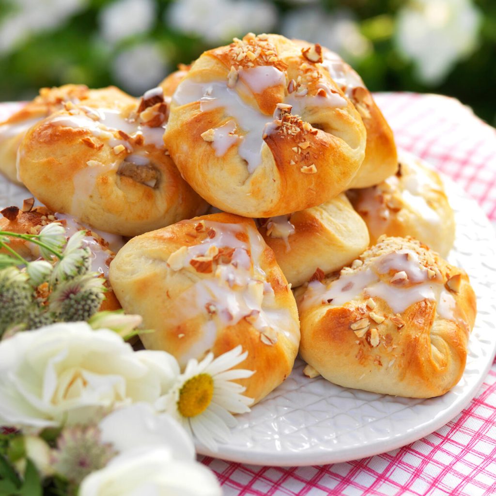 Lägg bullarna på en plåt med bakplåtspapper och låt jäsa övertäckta i 30 minuter. Pensla med uppvispat ägg och grädda i ca 10 minuter. Rör ihop florsocker och vatten och glasera bullarna när de svalnat.