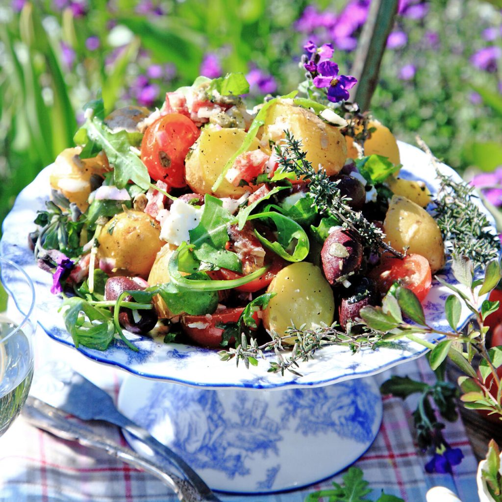 Blanda potatisen med salami, ost, lök, kapris och oliver. Smaka av med salt och peppar.