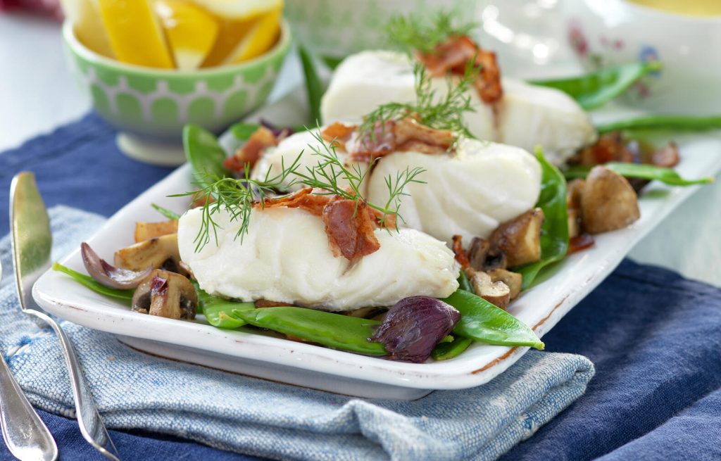 Skala lökarna och dela i klyftor. Ansa och dela champinjonerna i kvartar. Stek lök och champinjoner i smör i en stekpanna. Blanda med bacon och lägg i en form. Lägg på torskbitarna och droppa över citronsaft.