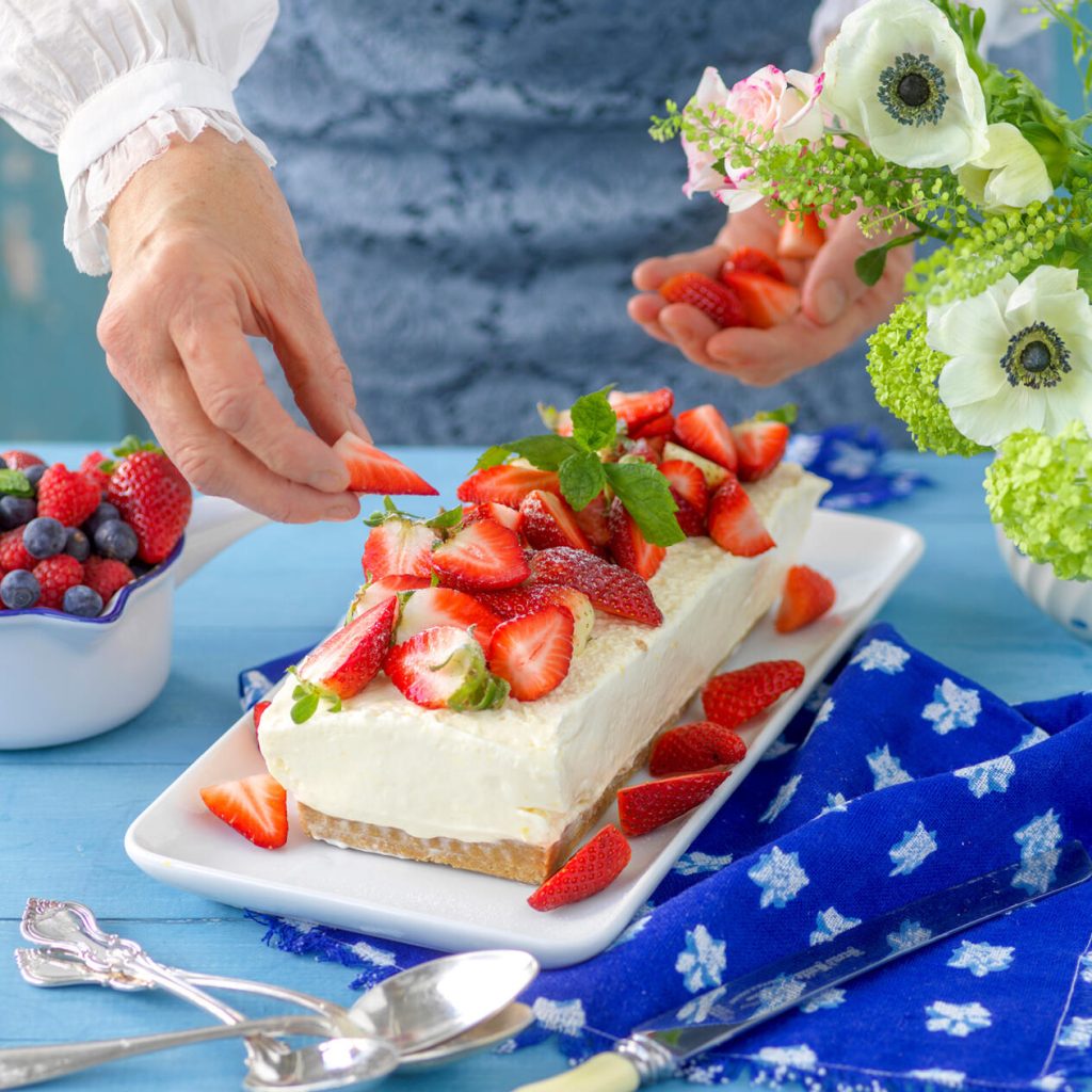 Låt stå svalt i kylen i minst 5 timmar, du kan även frysa kakan. Tag fram och vänd upp kakan ca 15 minuter innan servering. Toppa kakan med halverade eller kvartade jordgubbar och garnera med kryddgrönt. Sikta över florsocker.