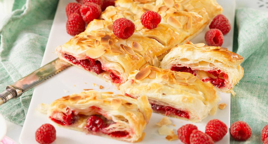 Skär remsor snett utåt från fyllningen, ca 7 remsor per sida. Vik in kortsidorna över fyllningen och vik remsorna omlott över fyllningen.