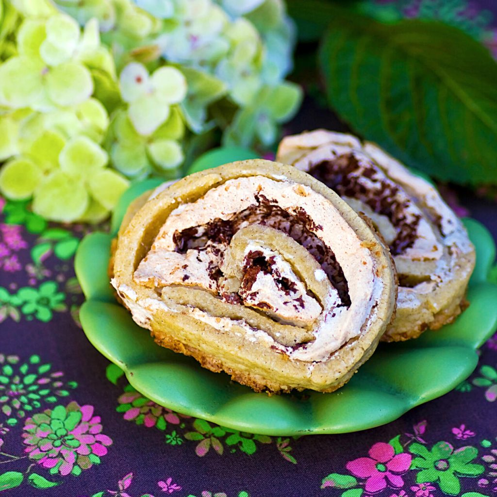 Kavla ut degen till en 4 mm tjock platta, ca 20 x 30 cm, på mjölat smörpapper. Vispa äggvitorna til styvt skum. Tillsätt sockret lite i taget medan du fortsätter att vispa. Bre marängsmeten över degen och strö den grovt rivna eller finhackade chokladen. Rulla försiktigt samman från långsidan. Lägg rullen på en skärbräda och låt stå i frysen i 1/2 timme.,