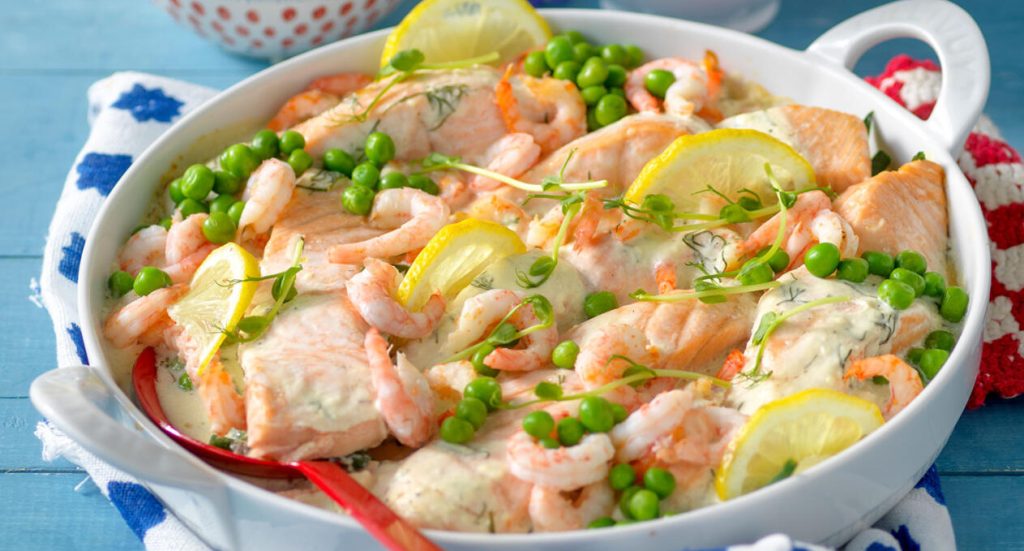 Putsa laxen och fördela bitarna tillsammans med bönorna i en smord eldfast form. Toppa med räkor. Häll såsen över och, peta med en gaffel så att såsen rinner ner överallt. Gratinera strax under ugnens mitt i ca 12–15 minuter.