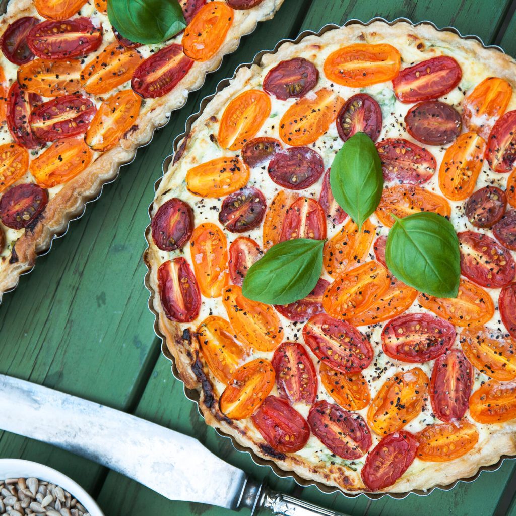 Skiva tomaterna, cirka 1 cm i tjocklek. Toppa tarten med tomaterna, salta och peppra. Baka klart i ugnen tills tomaterna fått fin färg, cirka 15 minuter.