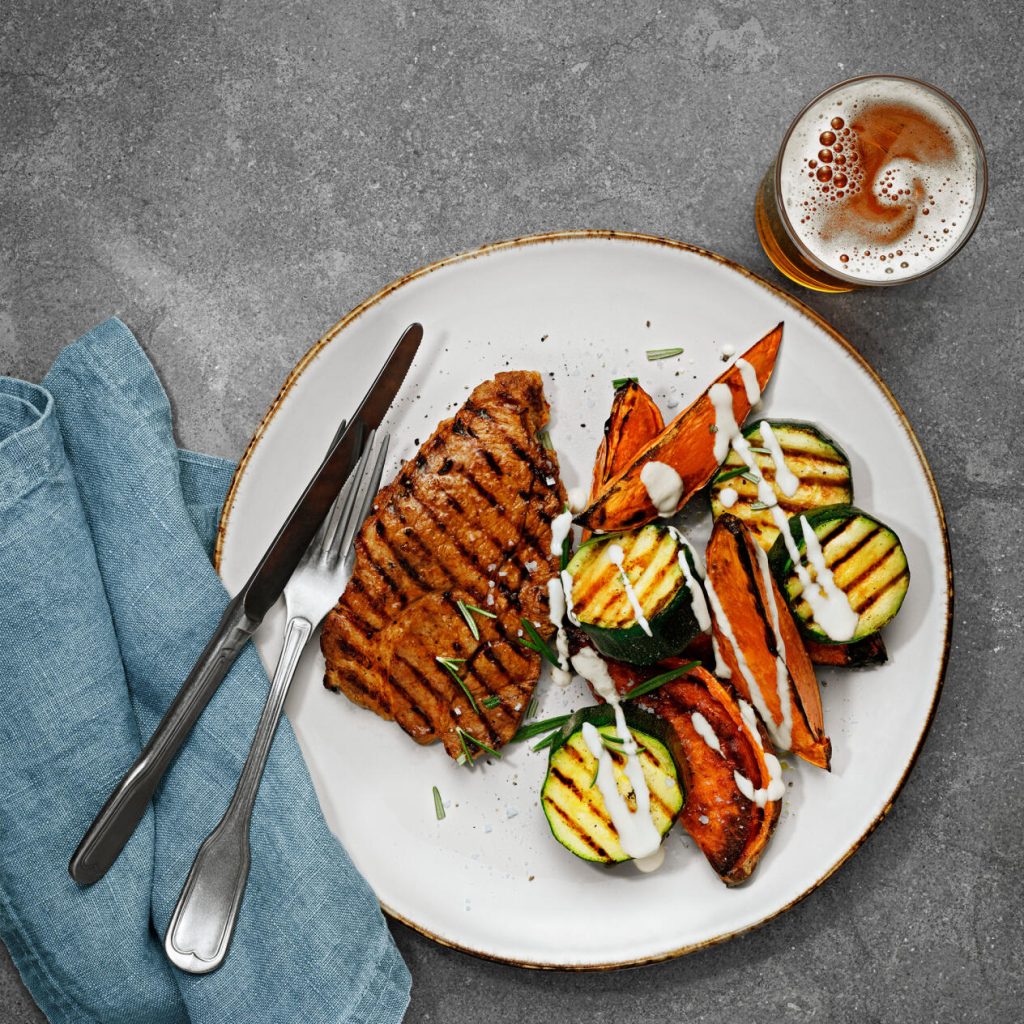 Grilla köttet tills det är genomstekt och ytan är lätt karamelliserad. Skär zucchinin i tjocka skivor och grilla tills de är mjuka. Servera köttet med sötpotatis, zucchini och fetaostsåsen.
