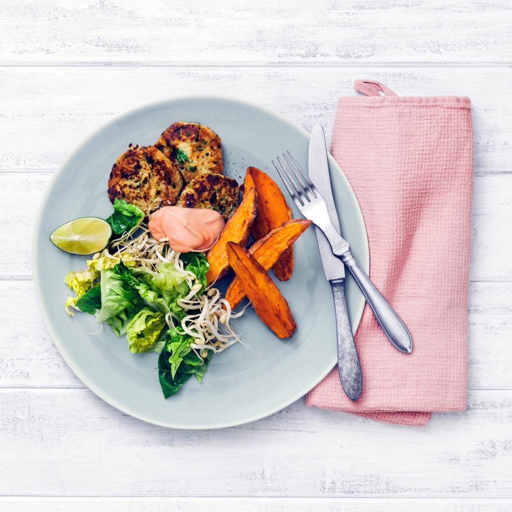 Skala och skär sötpotatisen i klyftor. Vänd runt i olja på en ugnsplåt med bakplåtspapper och salta. Rosta mitt i ugnen 20–25 minuter i 200 grader.