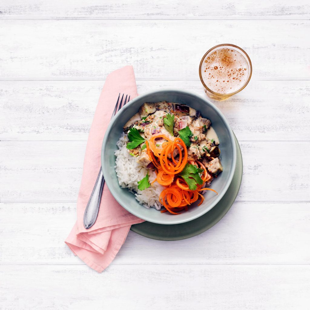 Koka riset enligt anvisningen på förpackningen. Skär auberginen i 1 cm tärningar och löken i lika stora bitar. Hetta upp olja i en kastrull eller wokpanna och tillsätt currypastan.