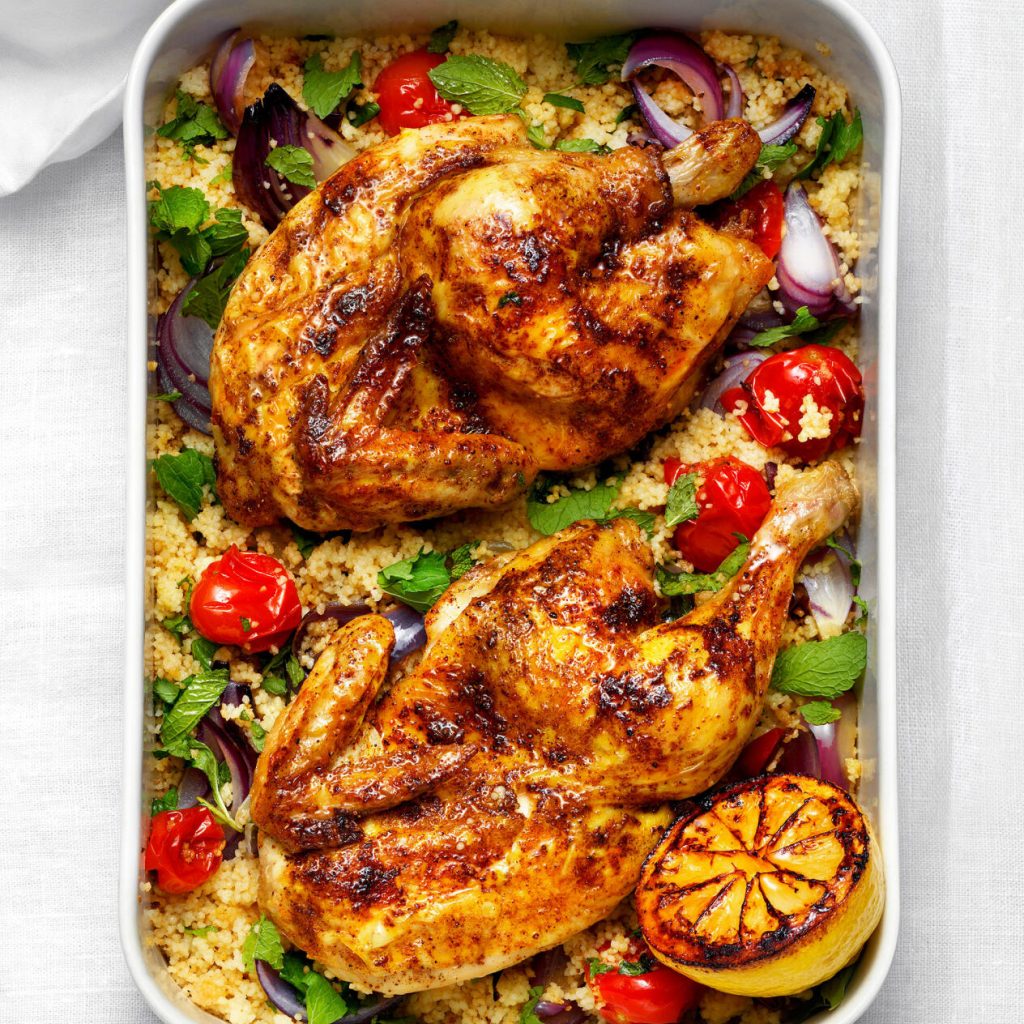 Lägg in tomaterna att rosta med kycklingen ytterligare 20 minuter. Laga couscous enligt anvisningen på förpackningen. Vänd varsamt runt couscousen med tomater, lök och mynta.