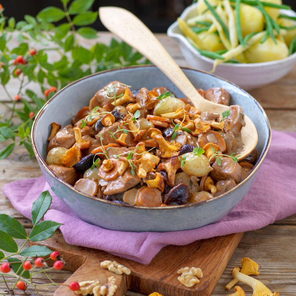 Ansa svampen och smörstek svampen i ett annat stekjärn under tiden. Toppa grytan med kantareller och garnera med timjankvistar. Servera med kokt potatis och bönor.