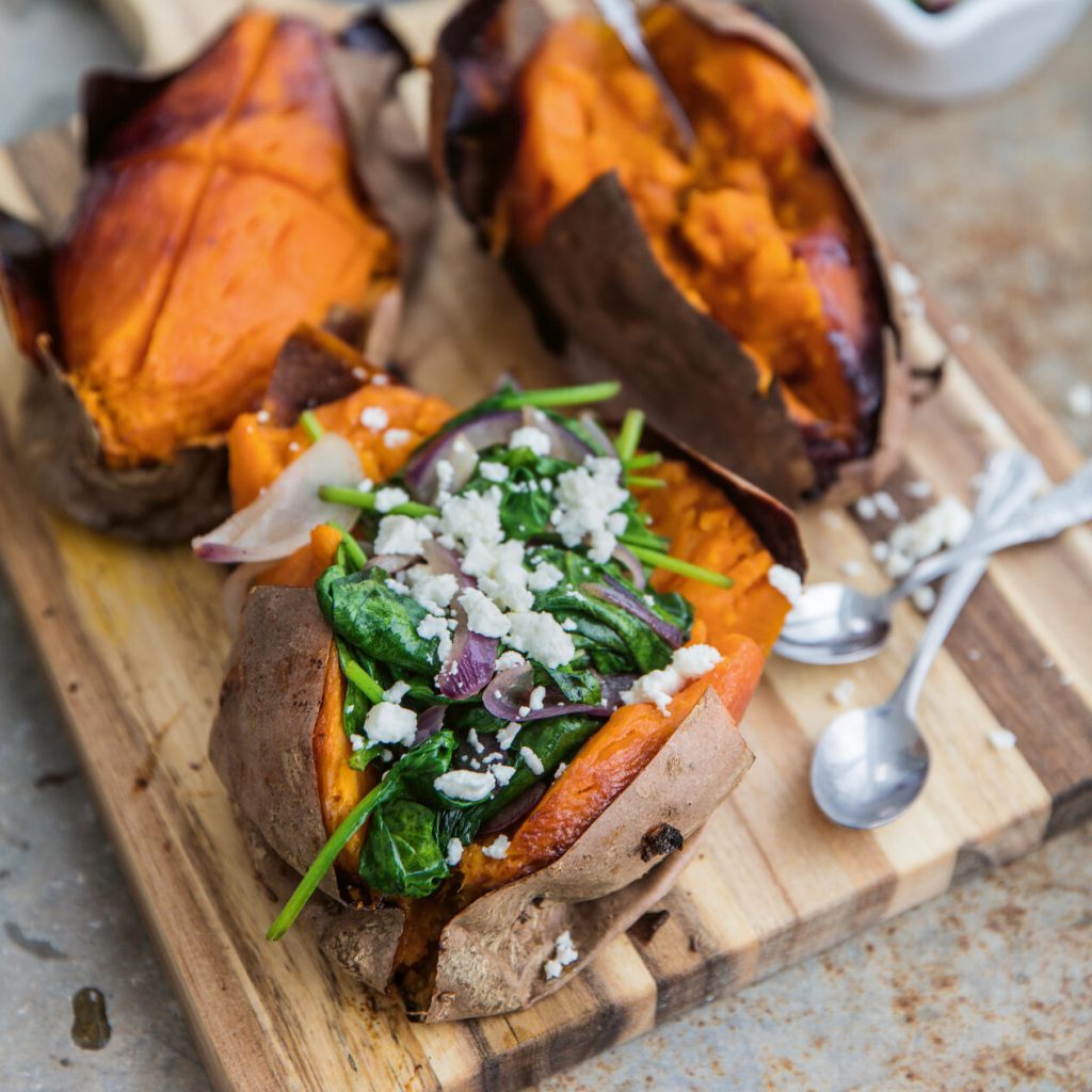 Kryssa potatisarna och fyll dem med spenatlöken och fetaost.