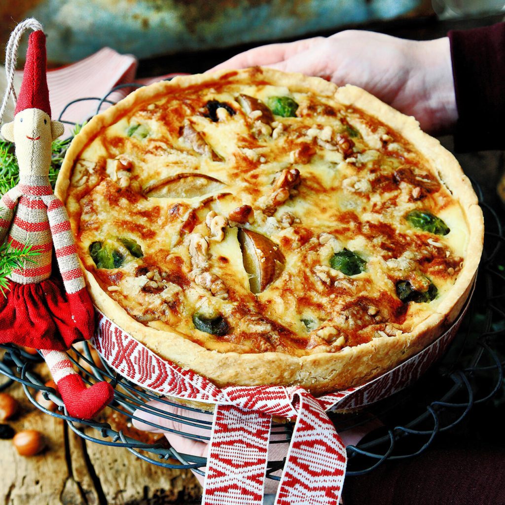 Lägg brysselkål och hälften av osten i pajskalet. Häll i äggstanningen. Fördela päronklyftor, delade nötter och resten av osten över.
