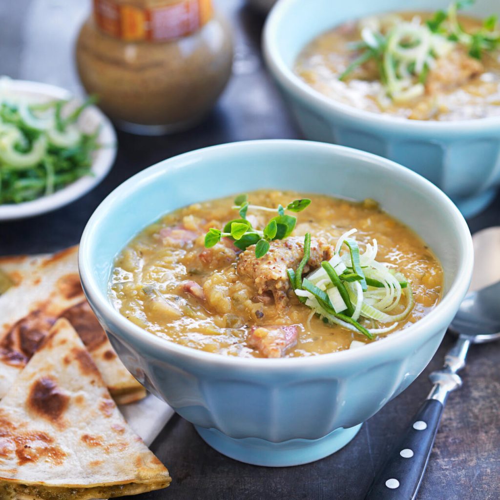 Strimla fläsket och stek tillsammans med purjolöken (spara eventuellt lite till servering) i en kastrull tillsammans med olja och de torra kryddorna.
