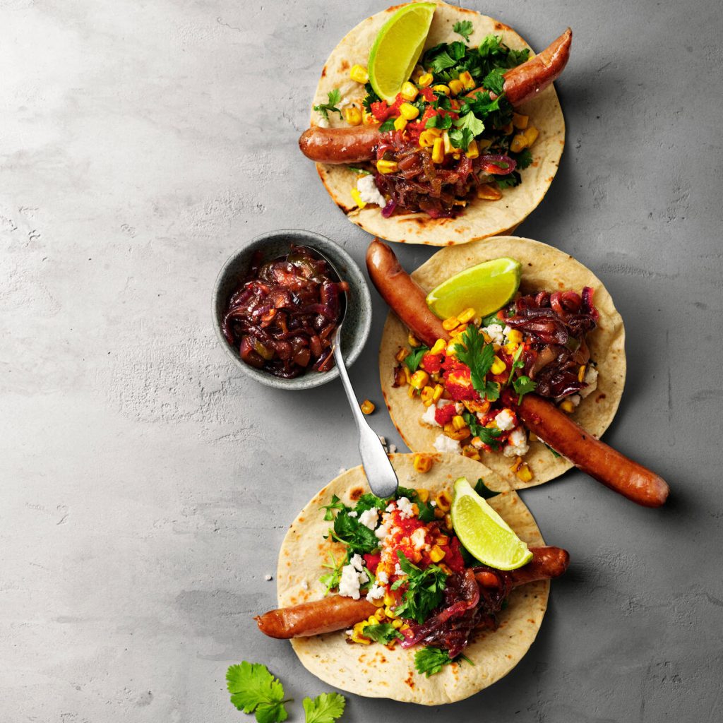 Stek korvarna i olja tills de har fin färg. Stek bröden och fyll med korv, lökchutney, majs, ajvar, fetaost och hackad koriander. Pressa eventuellt över lime vid servering.