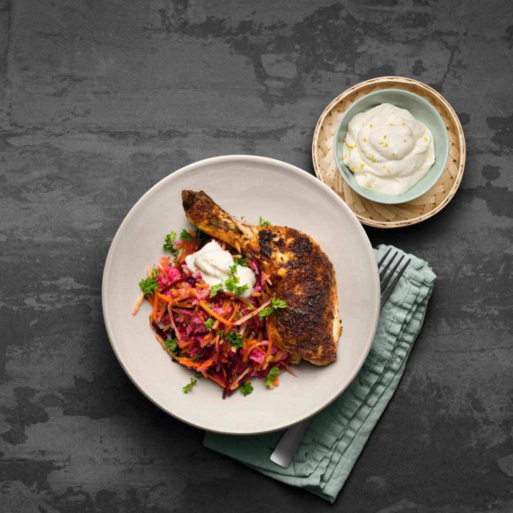 Lägg kycklingklubborna med skinnsidan upp i en ugnsform. Strö över grillkryddan och rosta mitt i ugnen cirka 40 minuter.