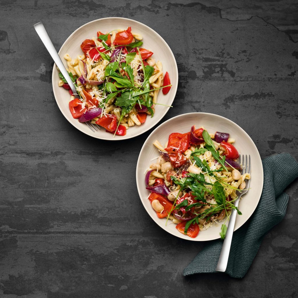 Vänd ihop pastan med bönröran. Servera med riven parmesan och basilika eller rucola.
