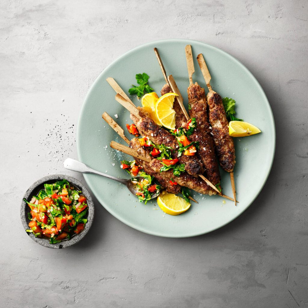 Färsspett: Riv löken grovt och blanda med vitlök, ingefära, fisksås, socker, peppar och salt. Tillsätt färsen och rör till en jämn smet. Krama färsen runt spett och låt gärna vila i kylen cirka 30 minuter.
