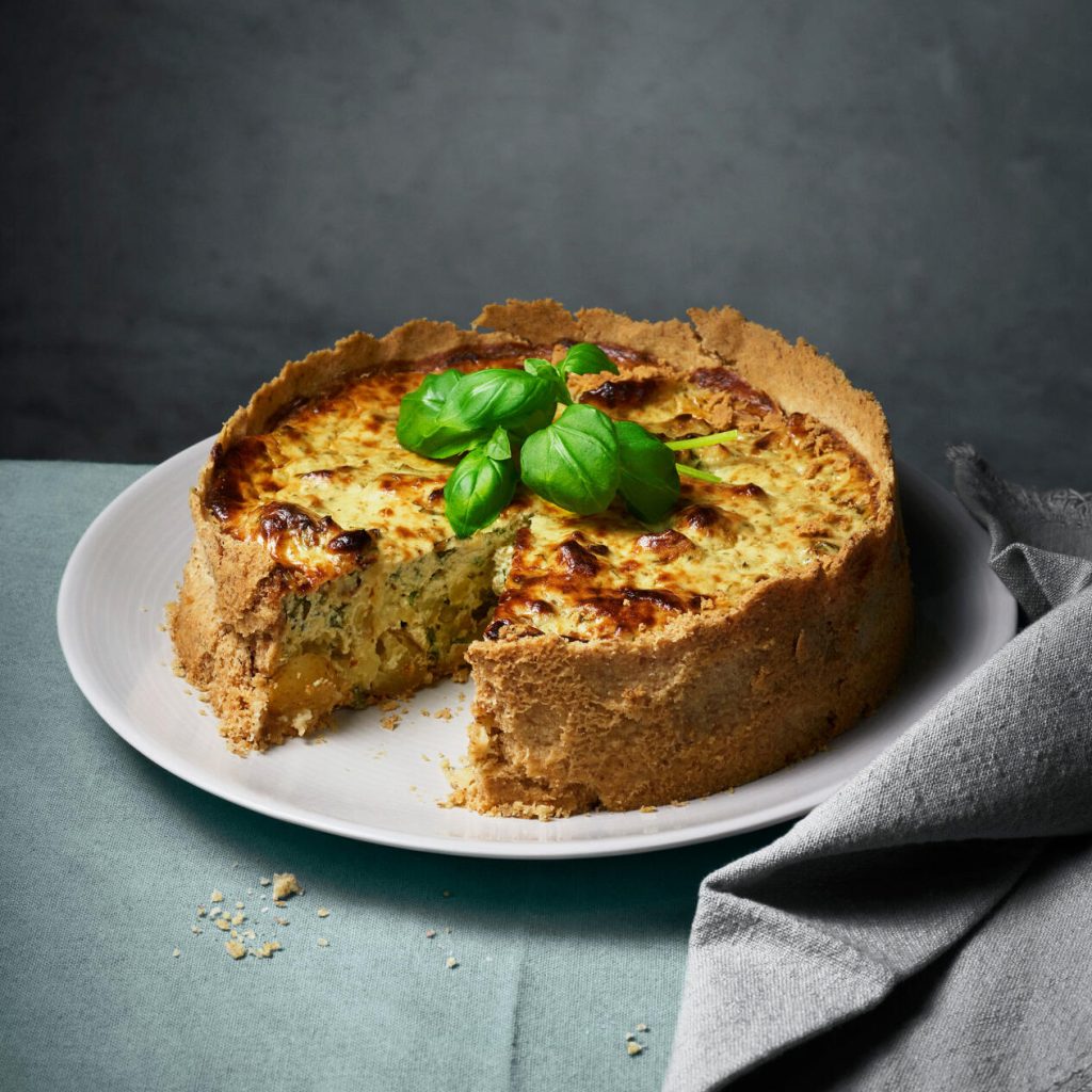 Peta runt lite med en sked så äggsmeten rinner ner ordentligt i potatisen. Grädda pajen mitt i ugnen till fin färg, cirka 40 minuter