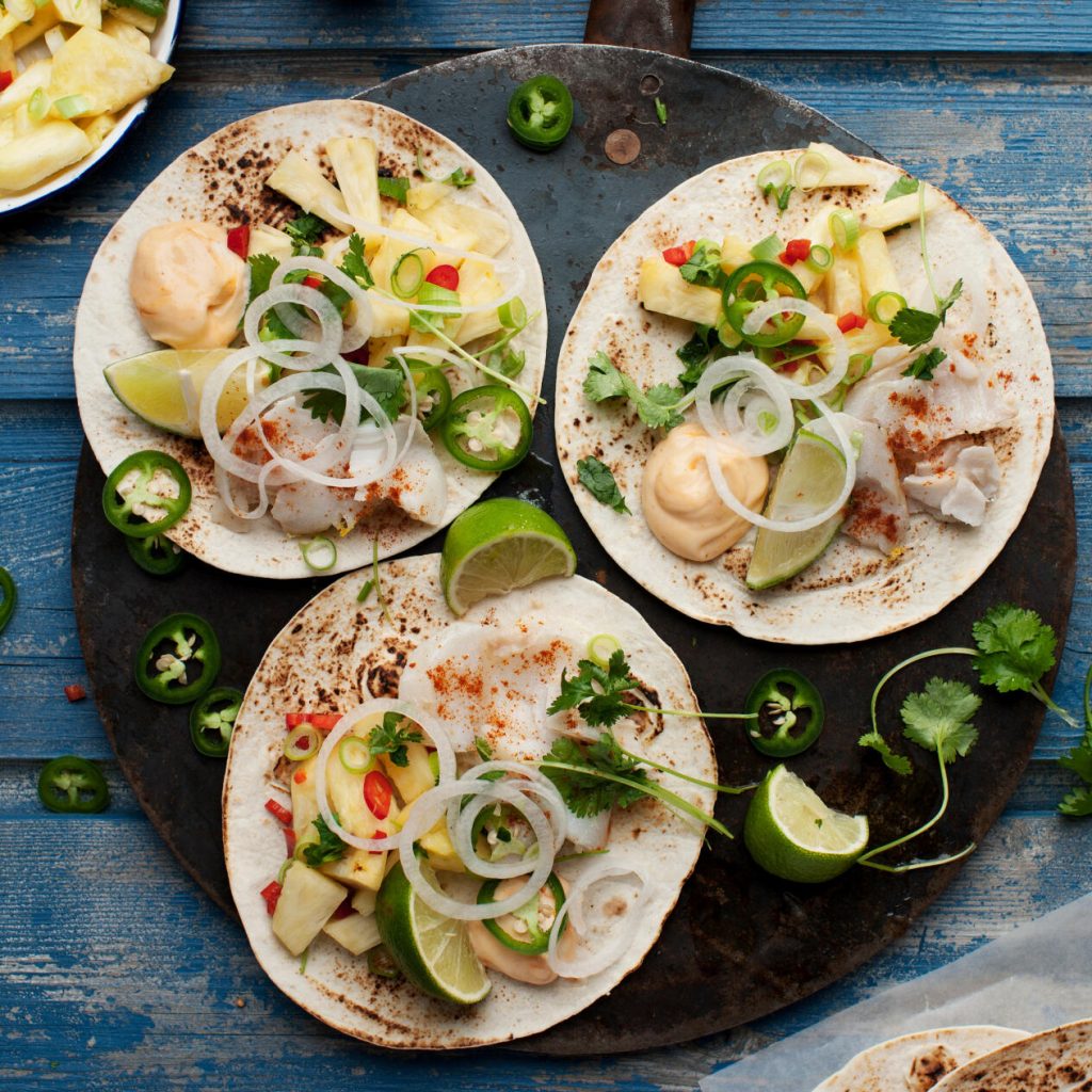 Dela fisken i bitar med en gaffel och servera tillsammans med ananassalsa, srirachamajonnäs, lök och jalapeño i varma tortillabröd. Toppa gärna med mera koriander och servera med extra limeklyftor.