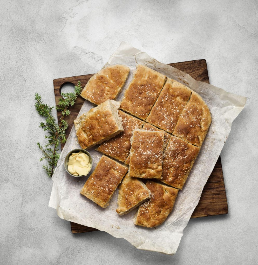 Klä en liten långpanna, cirka 20×30 cm, med bakplåtspapper. Tryck ut degen med blöta händerna i formen. Skåra rutor med en mjölad kniv och strö över lite vetekli eller havregryn. Låt jäsa 30 minuter till.