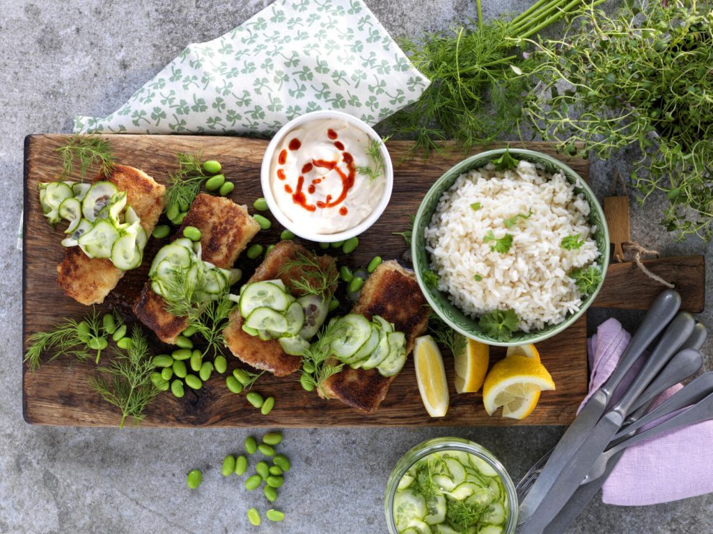 Servera fisken med chilimajonnäs, picklad gurka, ris och sojabönor.