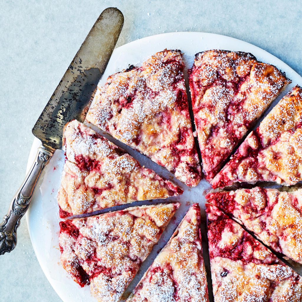 Blanda vetemjöl, bakpulver och salt i en skål. Smula ner smöret i blandningen. Blanda hallon, socker och vaniljsocker. Blanda ner det i mjölblandningen. Knåda samman degen lätt till en homogen klump.