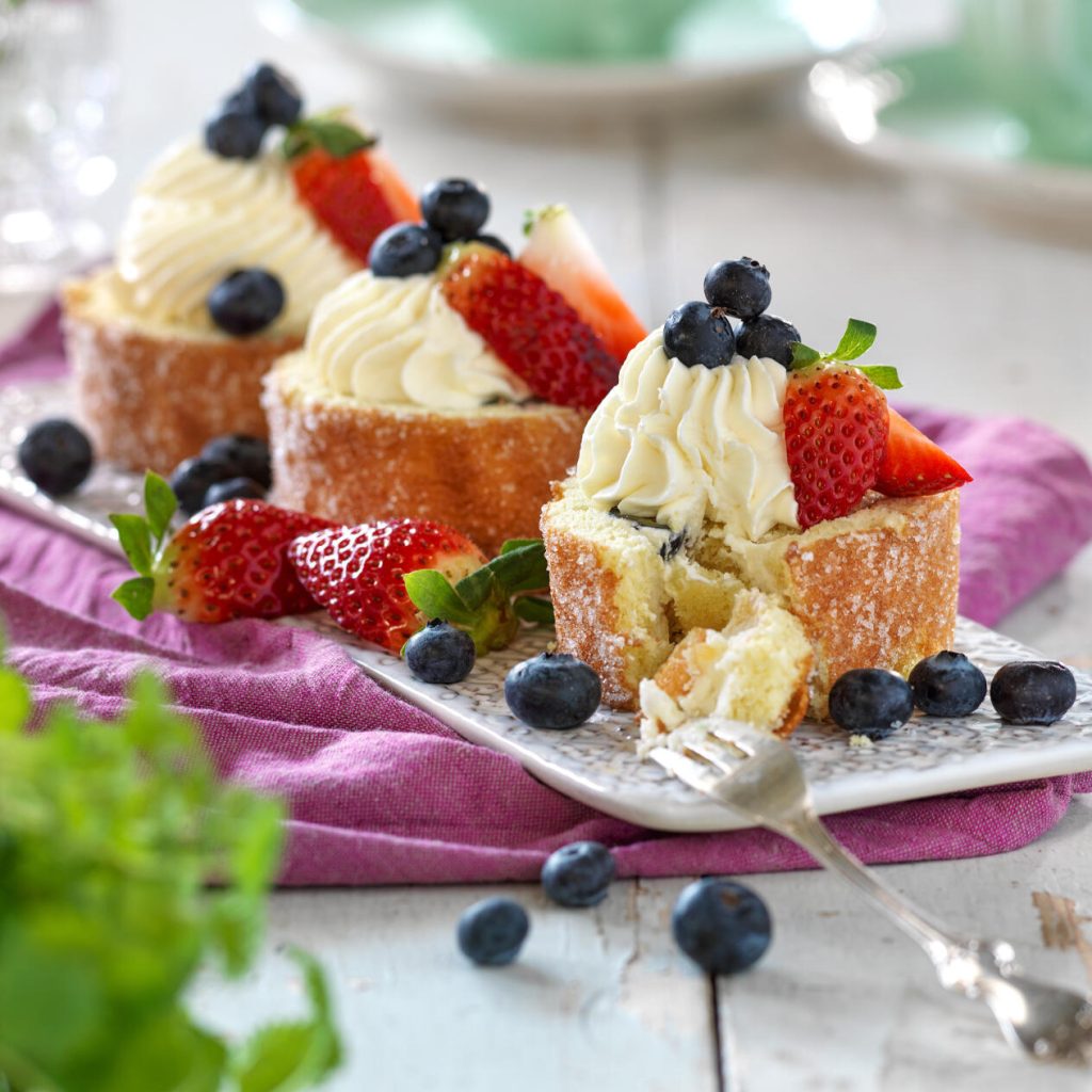Skär rulltårtan i 10 bitar. Vispa grädden och vispa i resten av fyllningen. Garnera med gräddfyllningen och toppa med jordgubbar och blåbär.