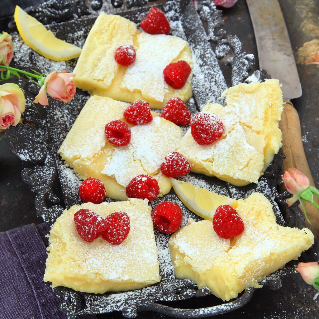 Servera kakan kylskåpskall. Pudra med florsocker och garnera med hallon.