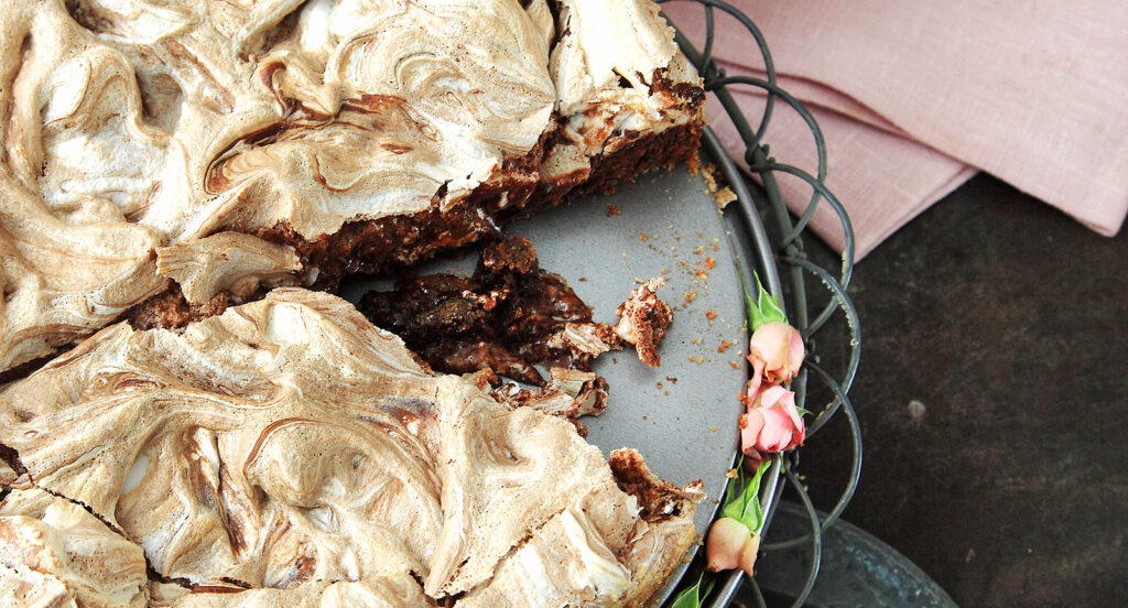 Ringla den smälta chokladen i marängsmeten och blanda försiktigt. Bred marängsmeten över kakan.