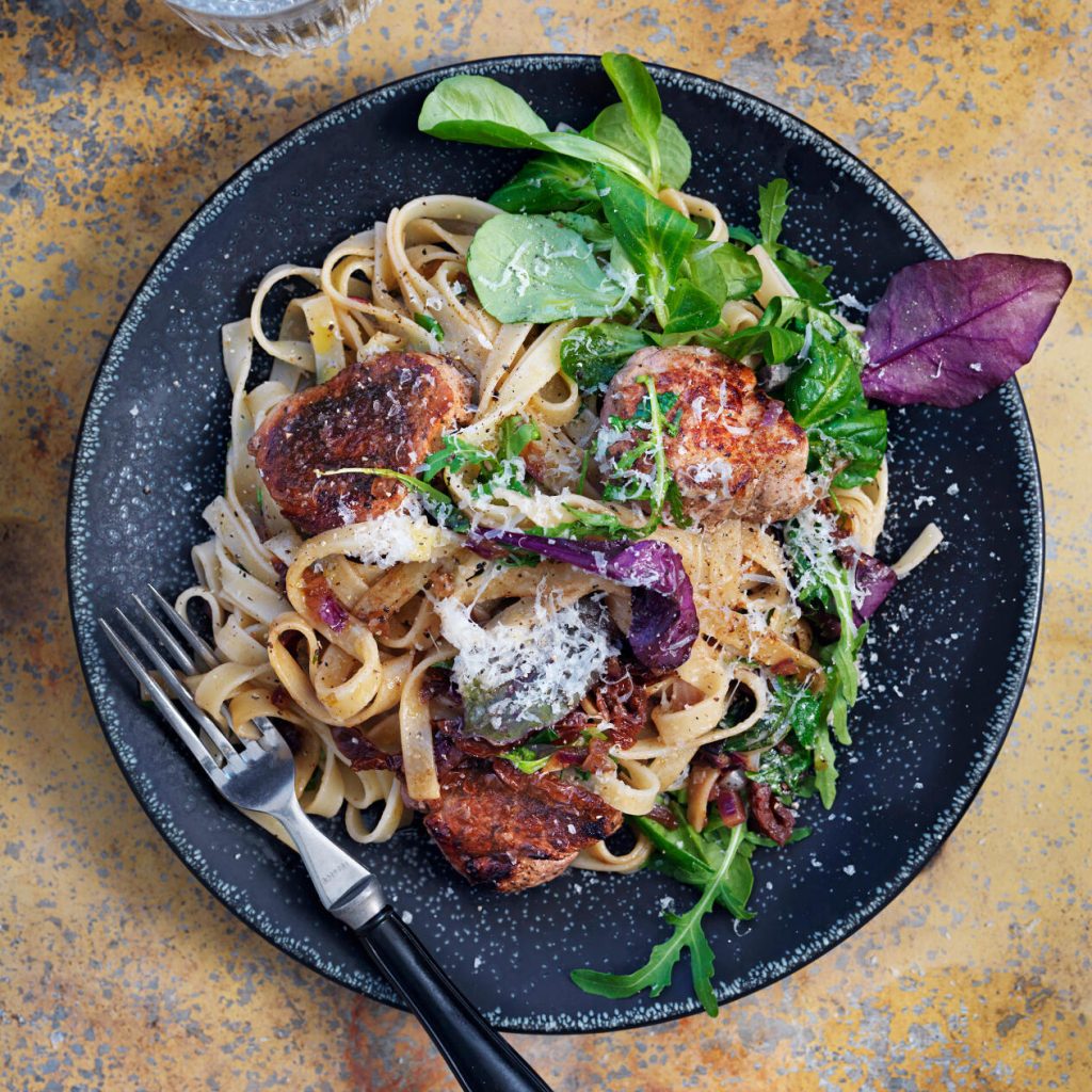 Häll ner stekskyn från stekpannan i såsen och mixa sedan slät med en stavmixer. Vänd ihop såsen med pastan och servera med köttet, sallad och basilika. Toppa med färskriven parmesan och svartpeppar.
