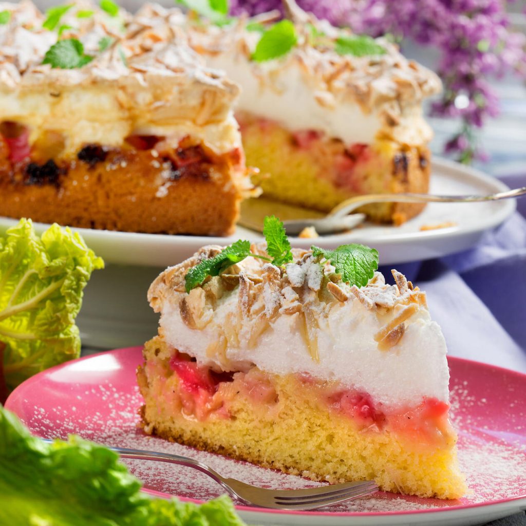 Blanda rabarbern med potatismjöl, socker och vaniljsocker. Fördela över smeten. Grädda kakan i nedre delen av ugnen, ca 20 minuter. Vispa under tiden äggvitorna fluffiga. Tillsätt sockret och fortsätt vispa till en fast, blank maräng. Fyll marängen i en spritspåse med stjärntyll och spritsa klickar på den halvgräddade kakan. Strö över mandelsplit. Fortsätt gräddningen ytterligare, ca 20 minuter. Sänk värmen till 150° sista 5 minuterna. Låt kakan svalna 10 minuter innan kanten tas bort. När kakan är kallnat läggs den upp på tårtfat.