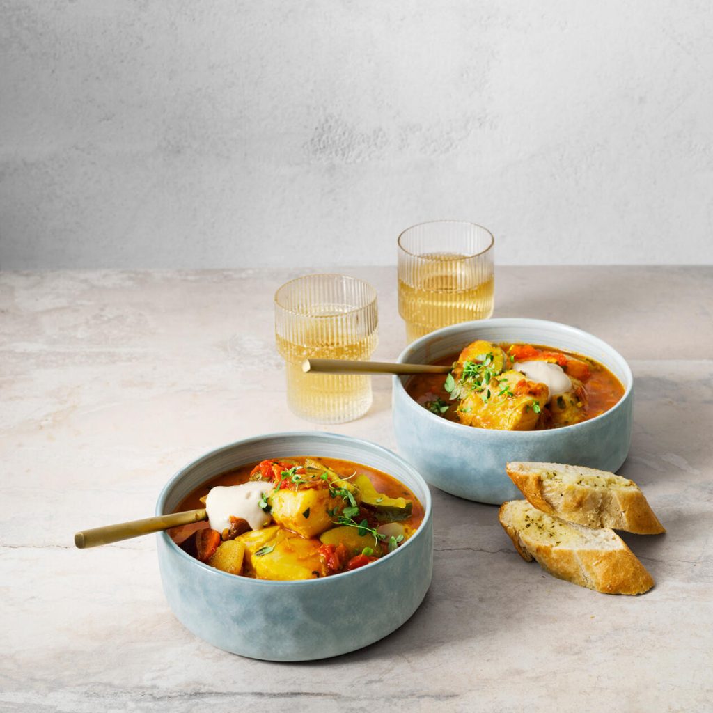 Grädda bröden enligt anvisningen på förpackningen. Blanda ingredienserna till aiolin och servera till grytan. Garnera fiskgrytan med timjan.
