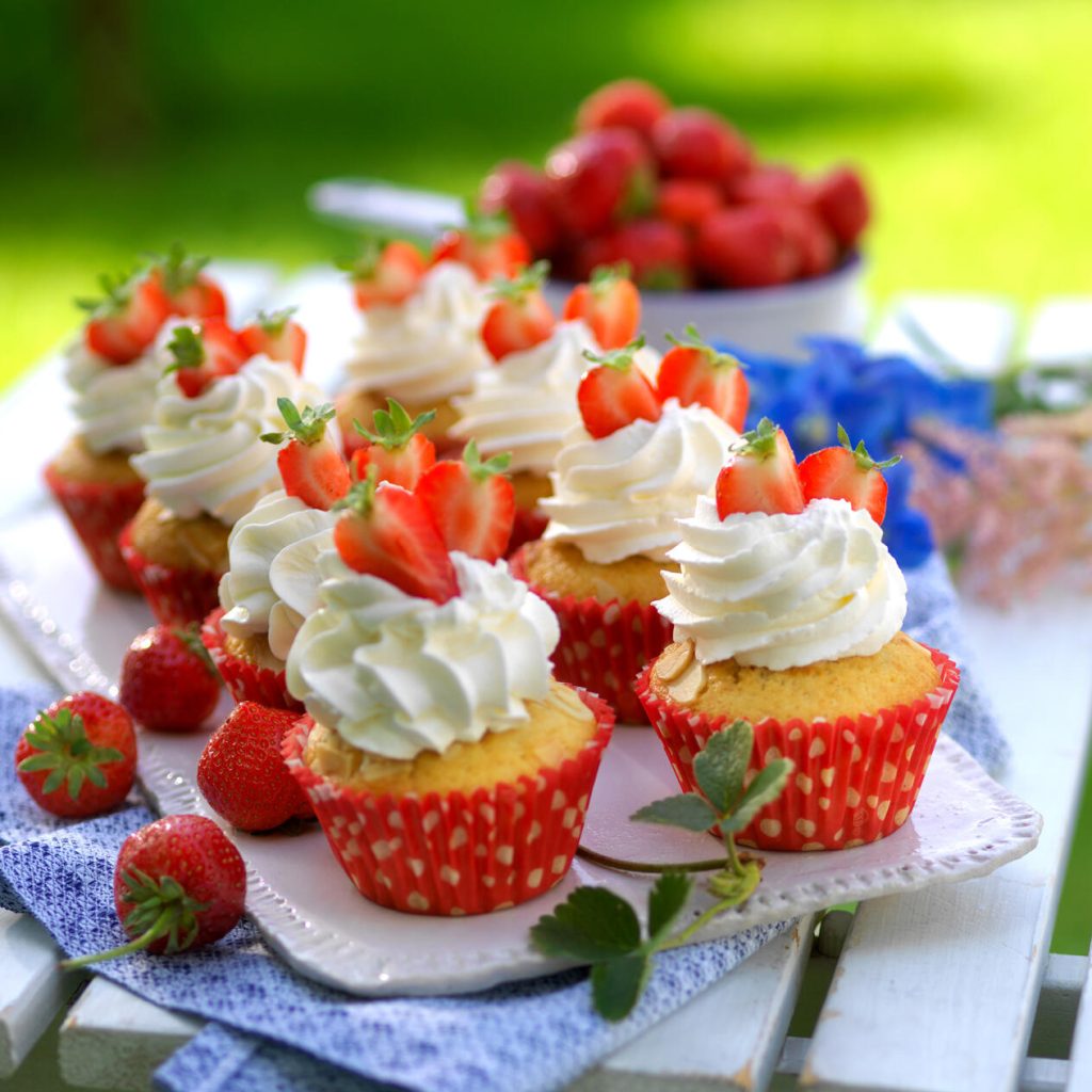 Topping: 2 dl vispgrädde och jordgubbar