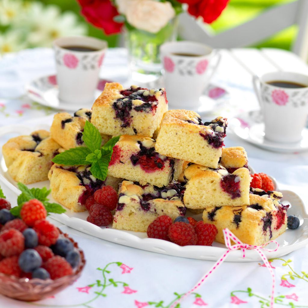 Strö över bär och chokladknappar. Grädda mitt i ugnen i ca 25 minuter. Låt kakan svalna och skär i rutor.