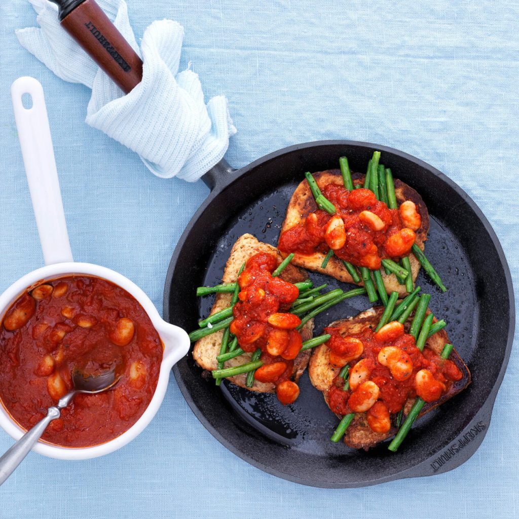 Hetta upp olja i en stekpanna och fräs haricots verts och vitlök 2–3 minuter. Smaka av med salt. Vispa lätt ihop ägg och mjölk. Doppa toastbröden och stek gyllene på båda sidor i smör.