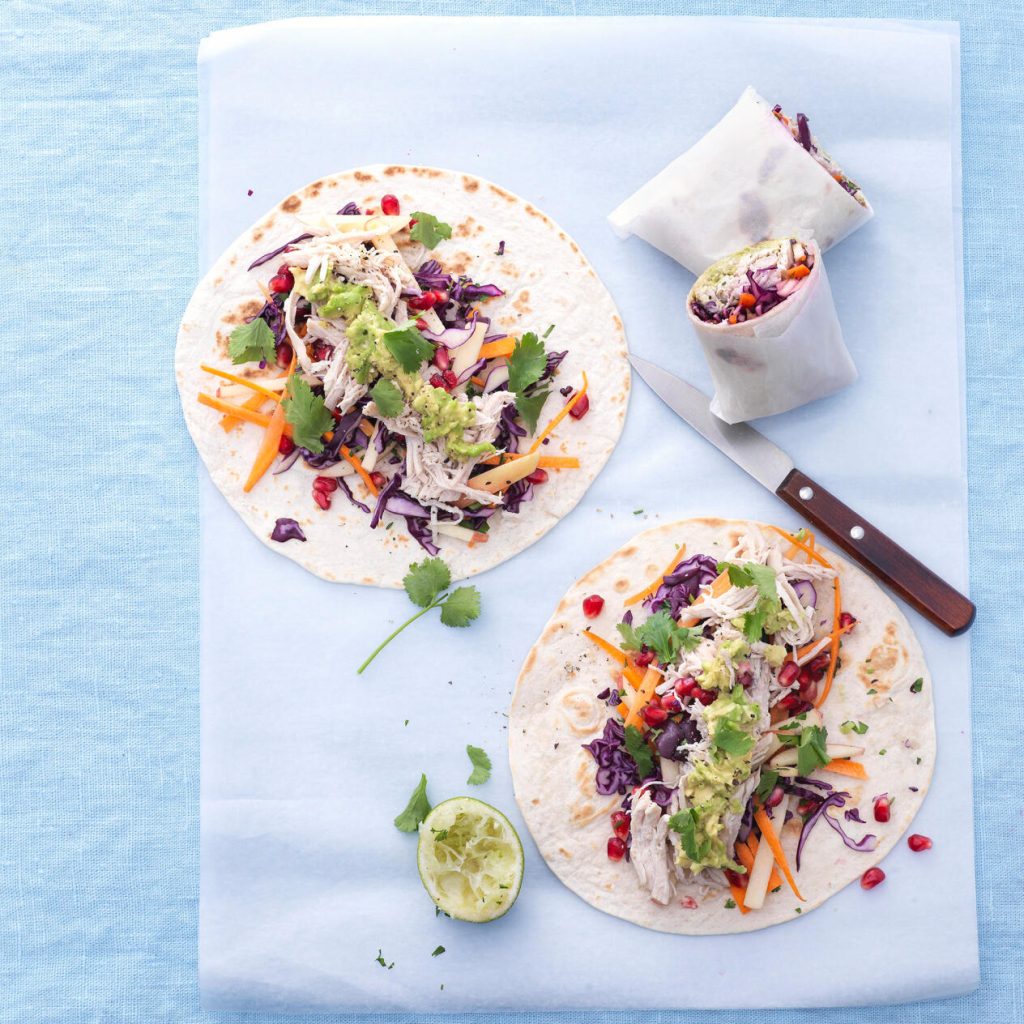 Blanda rödkål, granatäppelkärnor, äpple och morot med koriander, limeskal (endast det gröna), limesaft och salt. Fördela salladen och kyckling på stekta tortillabröd. Toppa med mosad avokado. Wrapsen är lika goda med varm som kall kyckling.