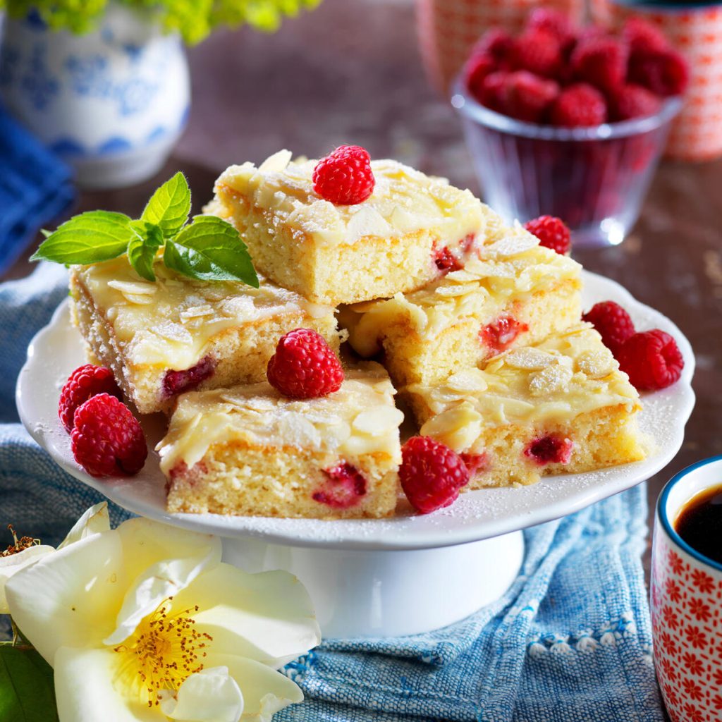 Bred ut smeten i en långpanna, 30×40 cm, klädd med bakplåtspapper och strö över hallon. Grädda mitt i ugnen i ca 30 minuter. Låt kakan svalna.