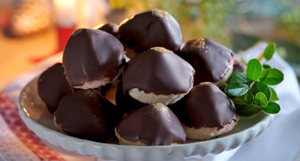 Bred krämen på undersidan av bottnarna. Ställ i kylen i 30 minuter. Smält chokladen över vattenbad. Doppa kakorna i chokladen och garnera med guldpulver.