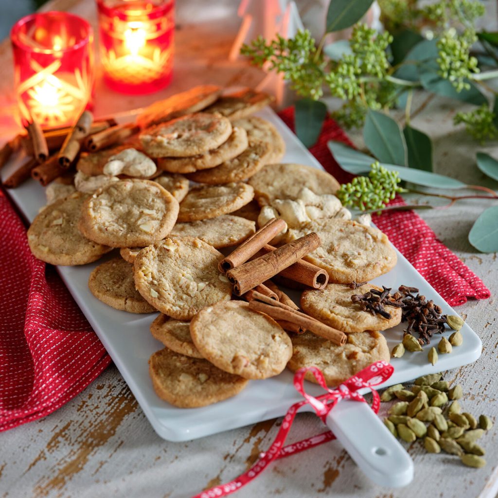 Hacka mandeln. Rör smör, socker, sirap och pepparkakskrydda smidigt. Tillsätt mandel, bikarbonat och mjöl, arbeta snabbt ihop till en deg.